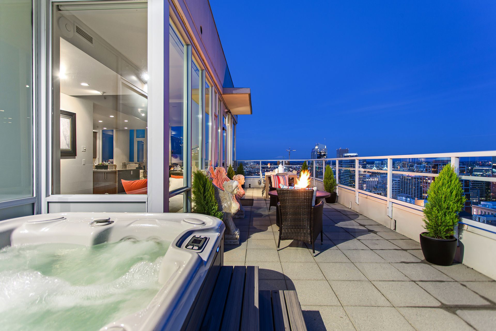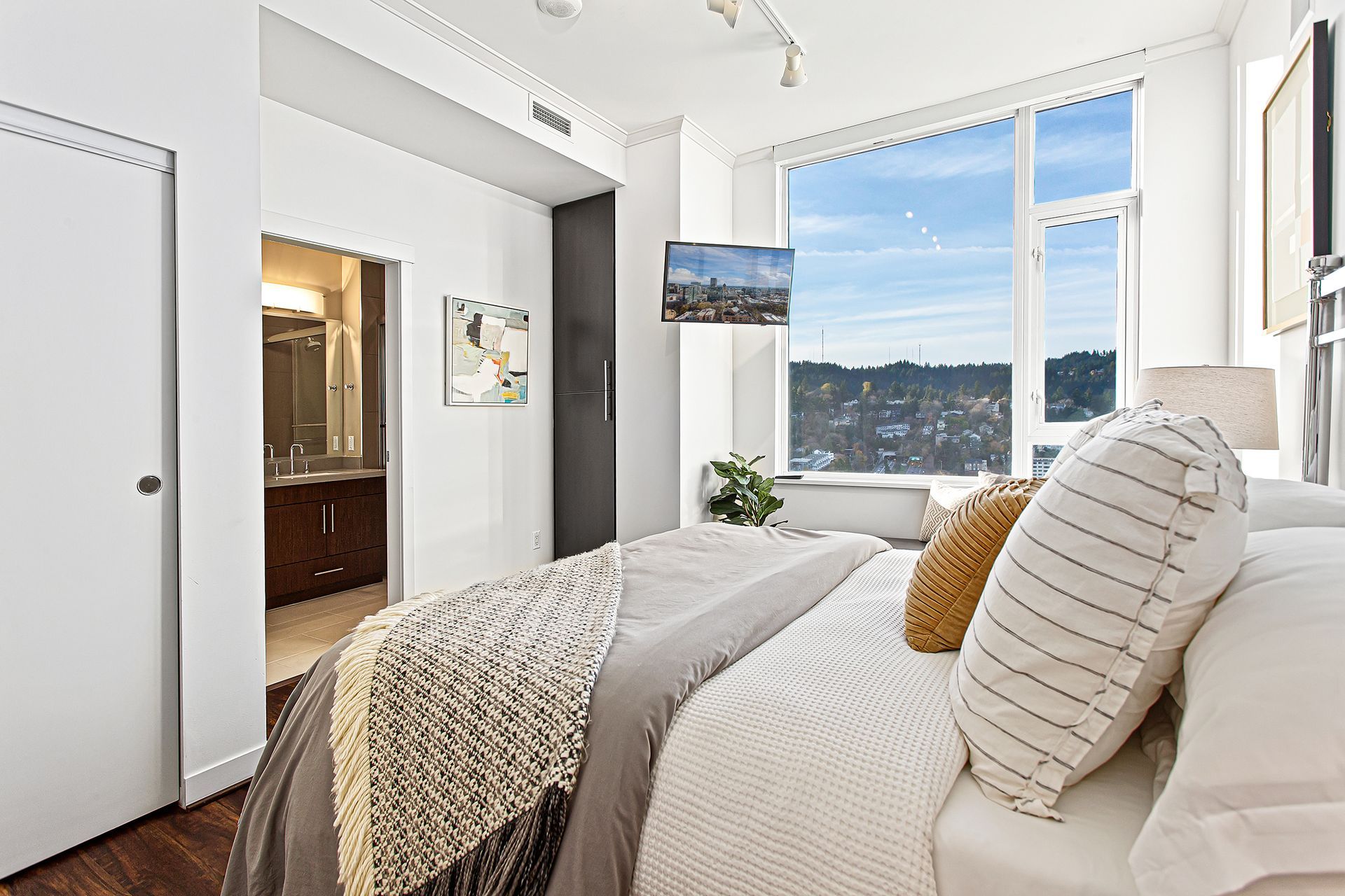 Spectacular 360-degree views of four iconic PNW mountains & the glittering PDX cityscape from the 27th floor penthouse at the top of Benson Towers in Portland's cultural district. Entertain outdoors & soak in the hot tub with jaw-dropping views as the backdrop on nearly 1400 sq. ft. of outdoor decks. Recently refreshed by the founder of Dave's Killer Bread, this condo spans a full floor and features a luxurious primary suite with decadent bath, two guest rooms & a light-filled home office. Private access to the locked out floor via key fob in secure building with three deeded parking spaces & storage unit.